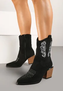 Czarne Botki Kowbojki Vices na Stożkowym Obcasie z Haftem Talfedi