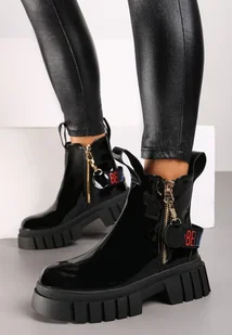 Czarne Botki Lakierowane Workery z Odpinaną Taśmą z Napisem Teribelle