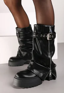 Czarne Botki na Grubej Podeszwie w Rockowym Stylu z Wywiniętą Cholewką Suwakiem Paskiem Merivette