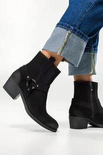 Czarne botki skórzane damskie kowbojki na klocku z paskami i ozdobą produkt polski casu 60477-36
