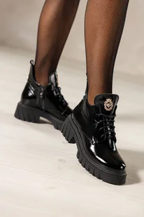 Czarne botki skórzane damskie lakierowane na bieżnikowanej platformie wycięta cholewka złota ozdoba na języku sznurowane PRODUKT POLSKI Casu 39458