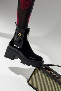 Czarne botki skórzane damskie lakierowane na platformie guma w cholewce z ozdobną agrafką produkt polski casu 60490-38