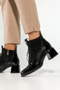 Czarne botki skórzane damskie na ozdobnym klocku lakierowany wzór wężowy sznurowane PRODUKT POLSKI Casu 60503-39