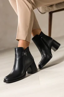 Czarne botki skórzane damskie Sergio Leone na klocku wycięta cholewka z ozdobą YG74790-H