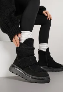Czarne Botki Śniegowce na Grubej Podeszwie Ozdobione Szerokimi Rzepami Amerria