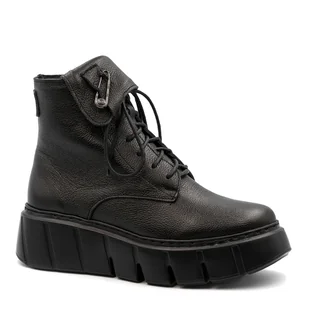 Czarne botki z agrafkami w kolorze niklu to doskonały wybór dla kobiet, które cenią nowoczesny styl i wygodę. Obuwie wykonane jest ze skóry naturalnej z widocznym uziarnieniem. Masywna podeszwa zapewnia komfort dla stopy. Wymiary podeszwy z przodu wynosi 4cm, a z tyłu 5,5cm. Zapięcie na suwak z boku ułatwia zakładanie i zdejmowanie, a sznurowanie powoduje dopasowanie do stopy.