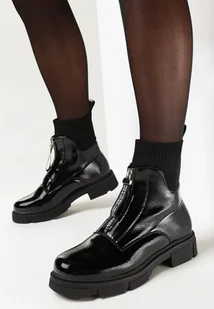 Czarne Lakierowane Botki z Dzianinową Cholewką i Suwakiem z Przodu Raicela