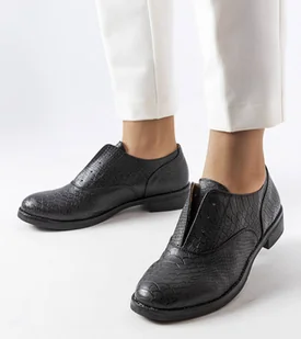 Półbuty Morel na płaskim obcasie. Niska cholewka sięga poniżej kostki. Buty sznurowane, wykonane z fakturowanej ekoskóry. Z przodu okrągłe noski. Model z wkł...