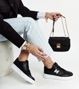 Czarne sneakersy na platformie Mentha to idealna propozycja dla osób śledzących najnowsze trendy. Te niskie, tanie buty są sznurowane i wykonane z gumy, co s...