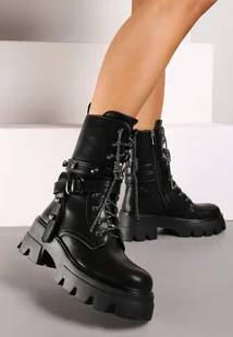 Czarne Botki Wysokie Workery na Grubej Podeszwie z Ozdobnym Paskiem i Łańcuchem Erimosa