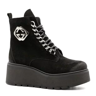 Czarne wiązane botki na koturnie wykonano z naturalnej skóry welurowej. Od wewnętrznej strony botków wszyto suwak. Zaokrąglone noski botków i pięty są zapastowane. Podszewkę wykonano z filcu, wkładkę z materiału tekstylnego. Orientacyjne wymiary dla rozmiaru 37 to: