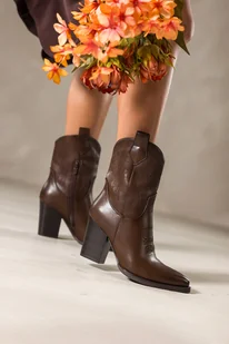 Czekoladowe botki damskie kowbojki wycięta haftowana cholewka ścięty obcas klocek Casu 8648