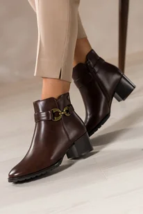 Czekoladowe botki damskie na szerokim słupku pasek ze złotą ozdobą Carla Y-6-8633