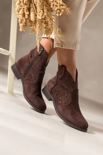 Czekoladowe botki damskie płaskie ażurowa cholewka Carla S7476-3