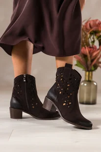 Czekoladowe botki skórzane damskie kowbojki ażurowe na ściętym obcasie wycięta cholewka PRODUKT POLSKI Casu 6605-7
