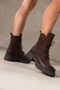 Czekoladowe botki skórzane damskie nubukowe workery z efektownym językiem na bieżnikowanej czekoladowej podeszwie sznurowane PRODUKT POLSKI Casu 8149