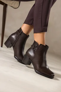 Czekoladowe botki skórzane damskie Sergio Leone obcas słupek na cholewce pasek ze stalową ozdobą YG74085-H