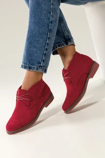 Czerwone botki damskie na płaskiej podeszwie z przeszyciami sznurowane Casu 8997-5