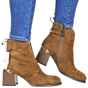Damskie Botki Skórzane na Ozdobnym Obcasie Panterka Vinceza 66811 Brązowe Zamszowe - VINCEZA