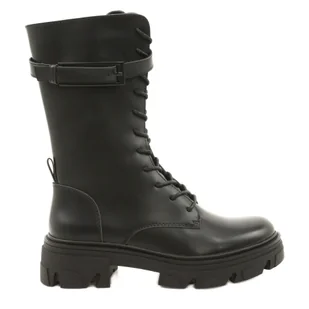 Botki wykonane są ze skóry ekologicznej, wewnątrz zaopatrzone we wkładkę futerkową i wyłożone tym samym materiałem wewnątrz botka, wiązanie z przodu i zamek do łatwego zakładania obuwia. Wzornictwo powoduje, że żadna kobieta nie pozostaje obojętna. Stabilny obcas 4,5 centymetrów, platforma 2,7 centymetrów, długość cholewki 23,5 centymetrów. Stylowe a zarazem klasyczne botki na chłodniejsze temperatury. Damskie glany wysokie Sergio Leone TR745 czarne.