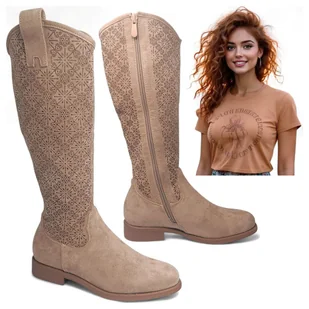 Kozaki Damskie Zamszowe wysokie Kowbojki ażurowe S.Barski HY52-534 Beżowe 39 Wybierając buty S.Barski, zyskujesz pewność lekkiego kroku i wsparcia, które prz...