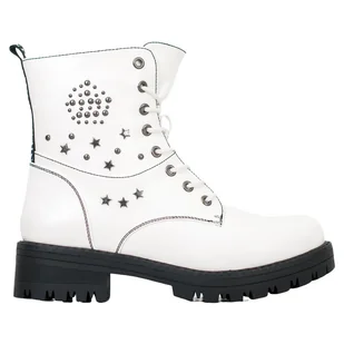 Modne i wygodne traperki damskie w kolorze białym. Buty wykonano ze skóry ekologicznej świetnej jakości. Podeszwa z solidnym bieżnikiem i sztywny zapiętek zapewniają w komfort w czasie chodzenia. Gwiazdki umieszczone na cholewce przyciągają uwagę i sprawiają, że ten model obuwia prezentuje się oryginalnie. Traperki spodobają się paniom, które nie boją się eksperymentów z modą.