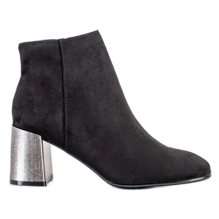 Eleganckie botki firmy Goodin w kolorze czarnym. O charakterze butów decyduje stylowy, szary obcas wysokości 7 cm. Wierzchnią część butów tworzy ekologiczna skóra zamszowa. Wewnętrzna wyściółka z materiału. Od wewnętrznej strony zamek błyskawiczny.