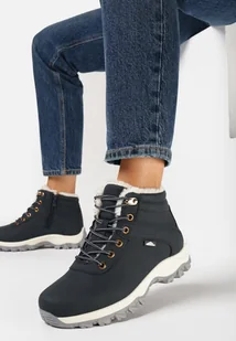 Granatowe Sznurowane Traperki na Płaskiej Podeszwie Wyścielone Futerkiem Magsira