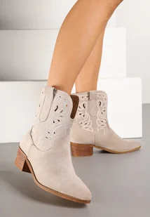 Jasnobeżowe Botki Vices na Obcasie w Stylu Kowbojek z Haftem Nelithraea