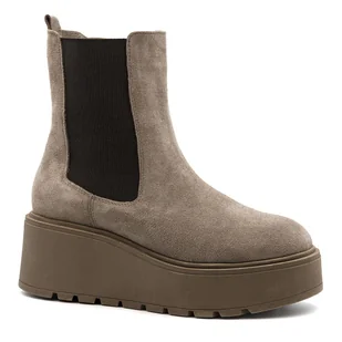 Kawowe botki z naturalnej skóry welurowej na niskim koturnie. Od zewnętrznej strony cholewki wszyto gumę, od wewnętrznej suwak. Podszewkę i wkładkę wykonano z filcu. Orientacyjne wymiary dla rozmiaru 37 to: szerokość cholewki na górze około 28 cm, a jej wysokość mierzona od podeszwy wynosi około 16 cm.