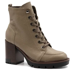 Kawowe, sznurowane botki na 8,5 cm stabilnym obcasie wyprodukowano z naturalnej skóry licowej z widocznym uziarnieniem. Buty posiadają z boku ocieplonej cholewki suwak. Noski botków delikatnie zaokrąglone. Podszewkę i wkładkę wykonano z filcu. Orientacyjne wymiary dla rozmiaru 37 to: