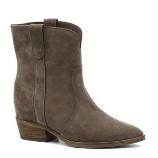 Eleganckie, kawowe welurowe skórzane botki bez zamka, na niskim 3,5 centymetrowym obcasie. Wysokość ukrytego koturnu 3,5 cm. Podszewka w botkach wykonana jest z materiału tekstylnego a wkładka z naturalnej skóry. Noski butów w delikatny szpic. W rozmiarze 37 szerokość cholewki na górze to około 31 cm, przy kostce około 34 cm a jejwysokość mierzona od podeszwy wynosi około 17 cm.