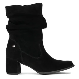 Maciejka Botki damskie na obcasie czarne Przedstawiamy model damskich botków polskiej marki Maciejka. Wykonane zostały z wysokiej jakości, naturalnej welurowej skóry w kolorze czarnym. Wnętrze wykonano z tkaniny, a wkładkę ze skóry naturalnej. Model z okrągłym, zamkniętym noskiem, wsuwany - nie posiada zamków, ani zapięć, z obcasem typu słupek o wysokości 6 cm. Jakość: I. Wyprodukowane w Polsce.