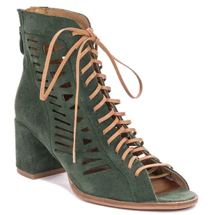 Maciejka Botki damskie skórzane ażurowe Zielone Oryginalny model renomowanej marki Maciejka to nowość z kolekcji wiosna/lato. Wygodne botki, które są jednocześnie sandałami dodadzą charakteru i wyrazistości każdej stylizacji. Cholewka to naturalna skóra welurowa w kolorze zielonym z ażurowym motywem w całości wiązana, tylną część cholewki zdobi zamek. Wiązanie pozwoli dostosować but do tęgości stopy, jest to niewątpliwy atut tego modelu. Dzięki dwojakiemu zapięciu sama decydujesz, którą formę wybierasz i która jest dla Ciebie wygodniejsza, podczas zakładania i zdejmowania.