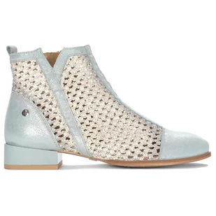 Maciejka Botki Damskie Skórzane Jasny Niebieski Stylowe botki marki Maciejka to połączenie niebanalnego designu i wyjątkowej wygody. Model ten zachwyca ażurową cholewką, która zapewnia świetną cyrkulację powietrza, idealną na cieplejsze dni. Połączenie błękitnej skóry naturalnej z beżowym wykończeniem dodaje butom subtelnej elegancji. Niski, stabilny obcas gwarantuje komfort podczas całodniowego użytkowania. To doskonały wybór dla kobiet ceniących oryginalny styl i wygodę w codziennych stylizacjach.