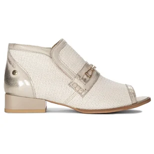 Maciejka Botki Damskie Skórzane Złota Przecierka Złote botki damskie Maciejka to doskonałe połączenie elegancji i wygody. Wykonane z naturalnej skóry, gwarantują trwałość i komfort noszenia. Ażurowa cholewka oraz otwarty nosek sprawiają, że buty są lekkie i przewiewne – idealne na sezon wiosenno-letni. Niski 3-centymetrowy obcas zapewnia wygodę, a zapinanie na zamek ułatwia zakładanie i zdejmowanie. Stylowy, złoty kolor z przecieranym efektem dodaje im unikalnego charakteru, dzięki czemu świetnie komponują się zarówno z codziennymi, jak i bardziej eleganckimi stylizacjami.