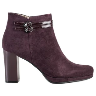 Damskie botki na 8,5-centymetrowym szerokim obcasie. Buty z zewnątrz wykonane są z ekologicznej zamszowej skóry, a w środku z miękkiego materiału tekstylnego. Cholewka na górze ma dwa ozdobne paski ze sprzączką, a jej sięgający za kostkę kołnierz z boku ma zamek błyskawiczny. Spodnią część stanowi gładka podeszwa z syntetyku. M. Daszyński Eleganckie Botki Z Paskami czerwone wielokolorowe.