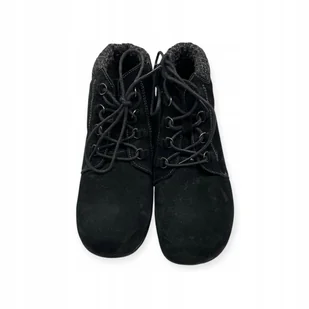 Naturalny zamsz Kolor: Czarny Wnętrze: Miękka, ocieplana wyściółka Zapięcie: Sznurowanie oraz boczny zamek dla łatwego zakładania Podeszwa: Gumowa, antypoślizgowa, zapewniająca dobrą przyczepność Stan: