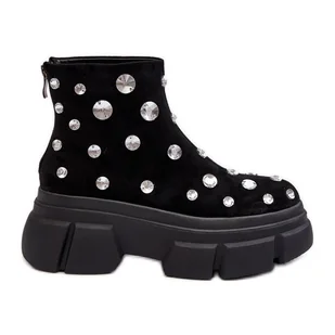Wyjątkowe, damskie botki posiadają na wierzchu ozdobne kryształki. Są niezwykle modne i wyjątkowe. Wnętrze zostało pokryte ciepłym i miłym w dotyku kocem obuwniczym, które gwarantuje komfort w każdej sytuacji. Botki osadzono na płaskim obcasie i masywnej platformie. Posiadają z tyłu cholewki suwak oraz usztywniany zapiętek.