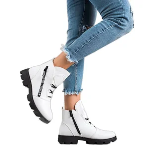 Białe botki skórzane damskie Sergio Leone na czarnej żłobionej platformie ozdobne przeszycia na cholewce sznurowane YG74751-H