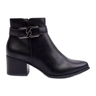 Damskie botki wykonane ze skóry ekologicznej. Osadzone na obcasie w postaci klocka. Noski w szpic optycznie wysmuklą nogi. Zapinane na suwak z boku. Na cholewce ozdoba z tworzywa sztucznego.