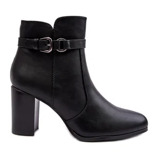 Damskie botki wykonane z eko skóry. Osadzone na obcasie w postaci stabilnego słupka. Noski w migdał. Cholewka ozdobiona paskiem z klamrą. Środek ocieplony kocem obuwniczym.