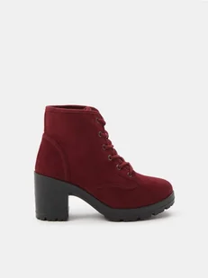 Sznurowane botki na obcasie kolorze bordowym. Wykonane z imitacji zamszu.