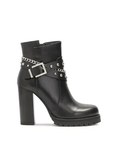 Czarne botki wykonane z najwyższej jakości skóry naturalnej są wyjątkowo stylowe i eleganckie. Posiadają solidną, ale jednocześnie kobiecą formę, z solidnym słupkiem zapewniającym stabilność. Platforma dodaje im dodatkowej wysokości oraz wspiera komfort chodzenia. Wyjątkowym zdobieniem tych botków są paski pokryte dżetami, które dodają blasku i przyciągają wzrok. Łańcuszek w srebrnym kolorze, delikatnie oprawiony wokół górnej części buta, dodaje elegancji i jest subtelnym, ale efektownym detalem. Całość tworzy bardzo nowoczesny i atrakcyjny design, który pasuje zarówno do wieczorowych stylizacji, jak i bardziej casualowych zestawów.