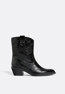 Botki na obcasie w stylu kowbojskim. Ozdobne przeszycia. Boczne paski w górnej części cholewki. Wysokość obcasa 4,5 cm.