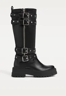 Płaskie botki z ozdobnymi klamrami na cholewce. Zewnętrzny zamek błyskawiczny na cholewce. Dostępne w kolorze czarnym. Wysokość podeszwy 6 cm.