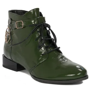 Trzewiki damskie Maciejka skórzane zieleń zgniła naplak lakier Oryginalne trzewiki, botki płaskie marki Maciejka to popularny typ obuwia ceniony przez wiele Pań bez względu na wiek. Oferowane trzewiki wykonane zostały z najlepszej jakości skóry naturalnej lakierowanej w kolorze zgniłej zieleni. Wnętrze buta oraz miękka, przyjemna wkładka wykonane są z lekko ocieplanej tkaniny. Dzięki wiązaniu możemy dostosować idealnie ten model do stopy, a wszyty po wewnętrznej stronie zamek błyskawiczny ułatwi nam zmianę obuwia Dodatkowo model wyposażony w pasek ze sprzączką na górze cholewki oraz oryginalną metalową ozdobę w kształcie kobiecej twarzy/maski. Model z migdałowym noskiem i obcasem 3 cm.