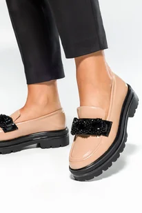 Elegancja spotyka się z nowoczesnością w beżowych mokasynach damskich lakierowanych na ozdobnej bieżnikowanej platformie z kryształkami Casu model JW24X3-N-N...