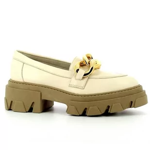 Mokasyny na platformie to nasza stylowa propozycja na sezon wiosenny, która jest absolutnym hitem! Są uniwersalne, a ich oryginalny design ożywi niejeden outfit. Niezaprzeczalnym atutem naszych mokasyn jest doskonała jakość. Cholewkę okala naturalna skóra licowa, cechująca się wyjątkową miękkością i trwałością. Masywna i gruba platforma doda Ci kilku cennych centymetrów wzrostu oraz sprawi, że poczujesz się wygodnie. Wzrok przyciąga złota ozdoba w zestawieniu z beżową kolorystyką cholewki.