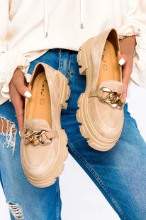 Beżowe mokasyny na platformie półbuty ze złotym łańcuchem polska skóra Casu 08251/2132/00/00/003-41
